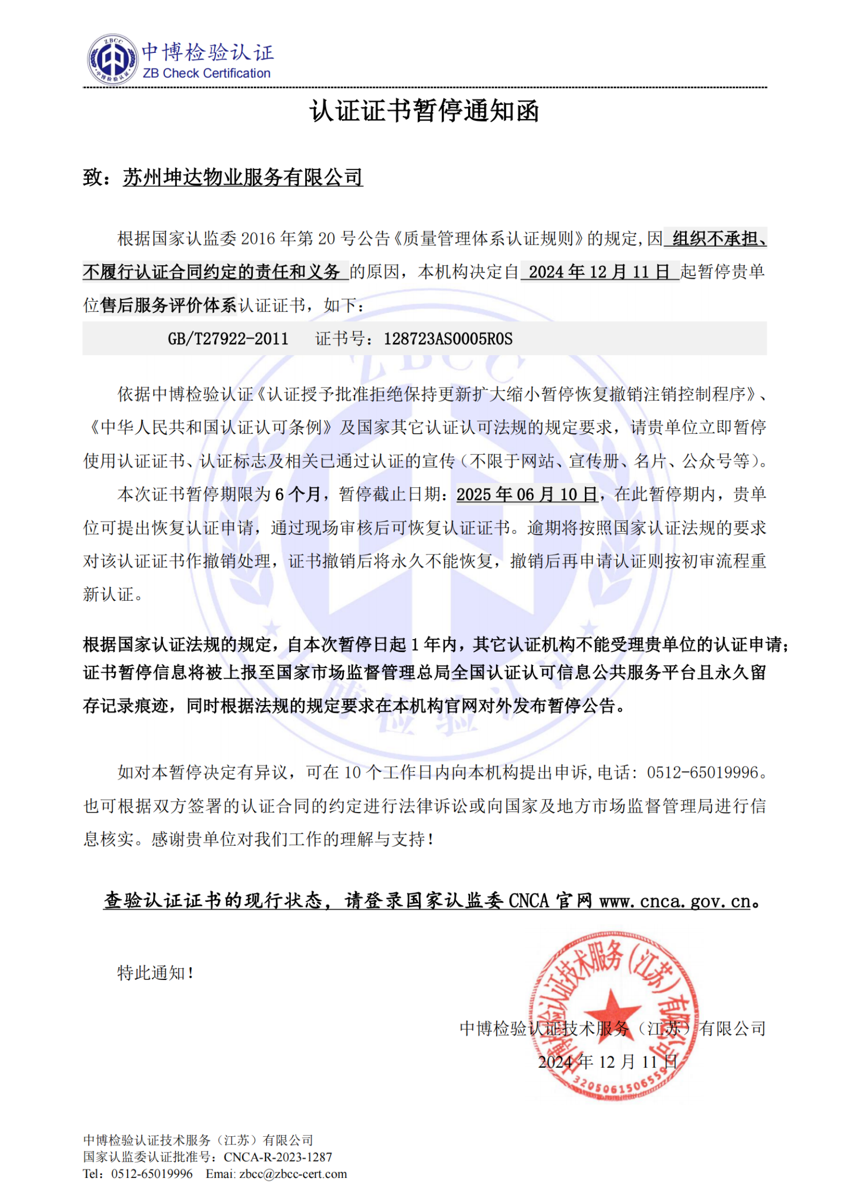 2、证书暂停/撤销信息将被上报至国家市场监督管理总局全国认证认可信息公共服务平台且永久留存暂停/撤销记录痕迹。