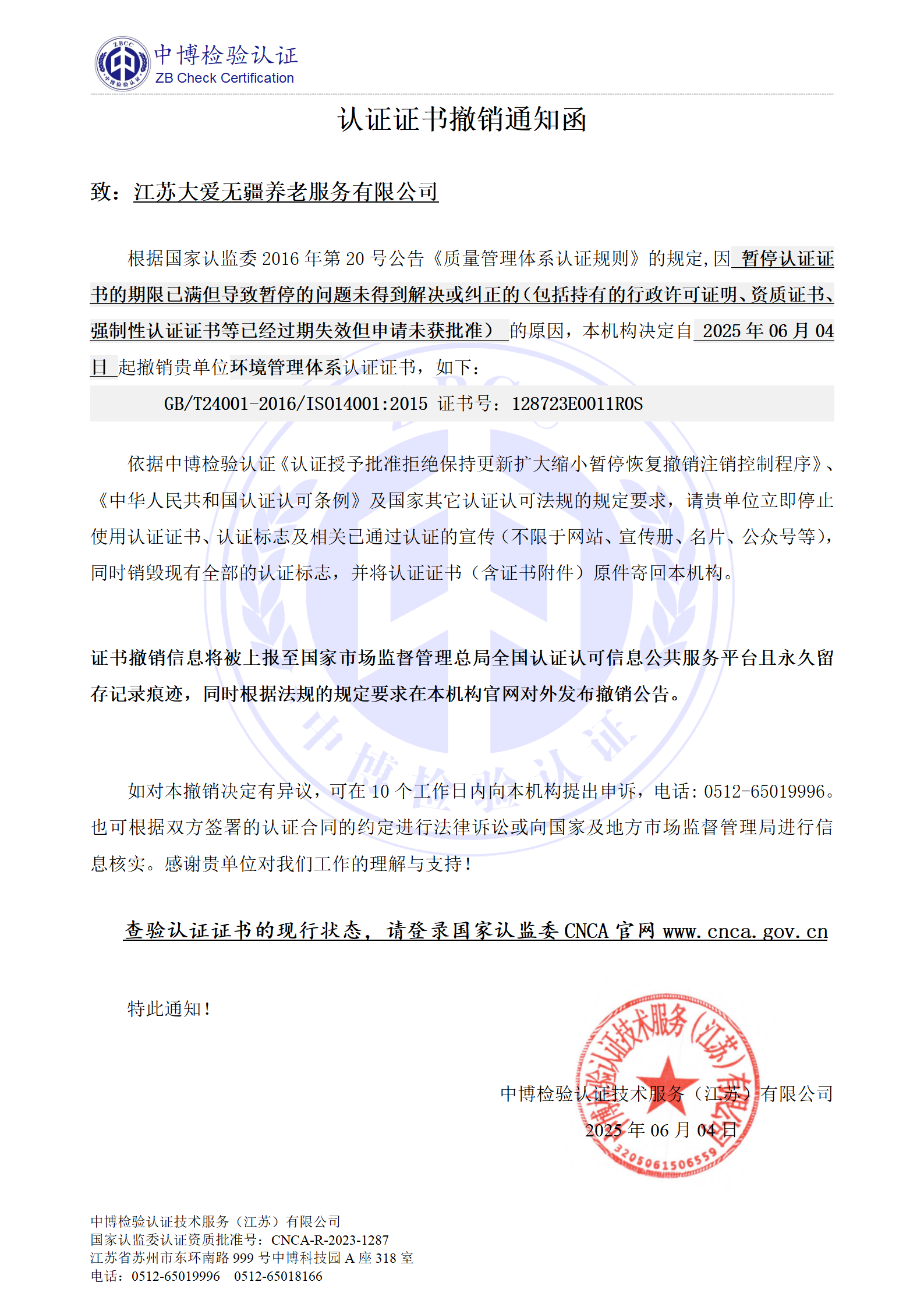 2、证书暂停/撤销信息将被上报至国家市场监督管理总局全国认证认可信息公共服务平台且永久留存暂停/撤销记录痕迹。