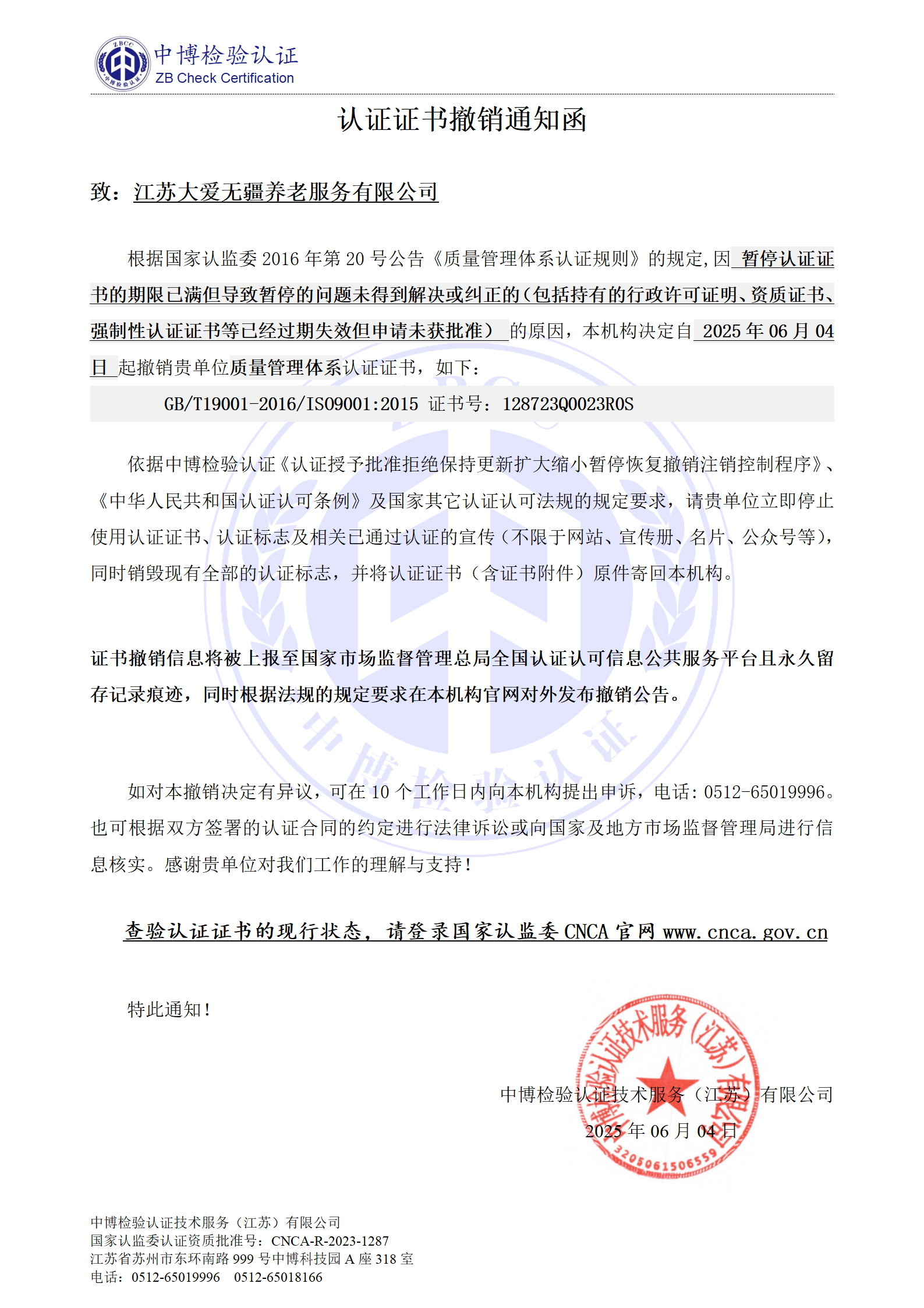 撤销江苏大爱无疆养老服务有限公司IS09001:2015 质量体系认证证书