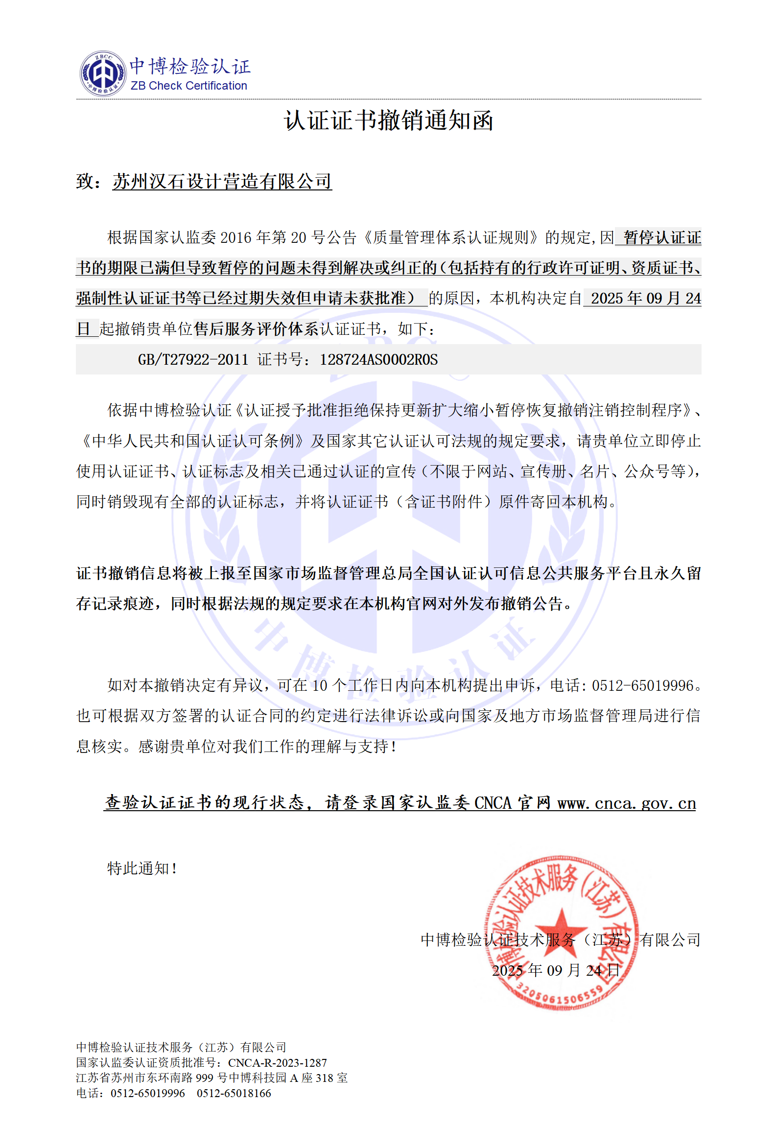 2、证书暂停/撤销信息将被上报至国家市场监督管理总局全国认证认可信息公共服务平台且永久留存暂停/撤销记录痕迹。