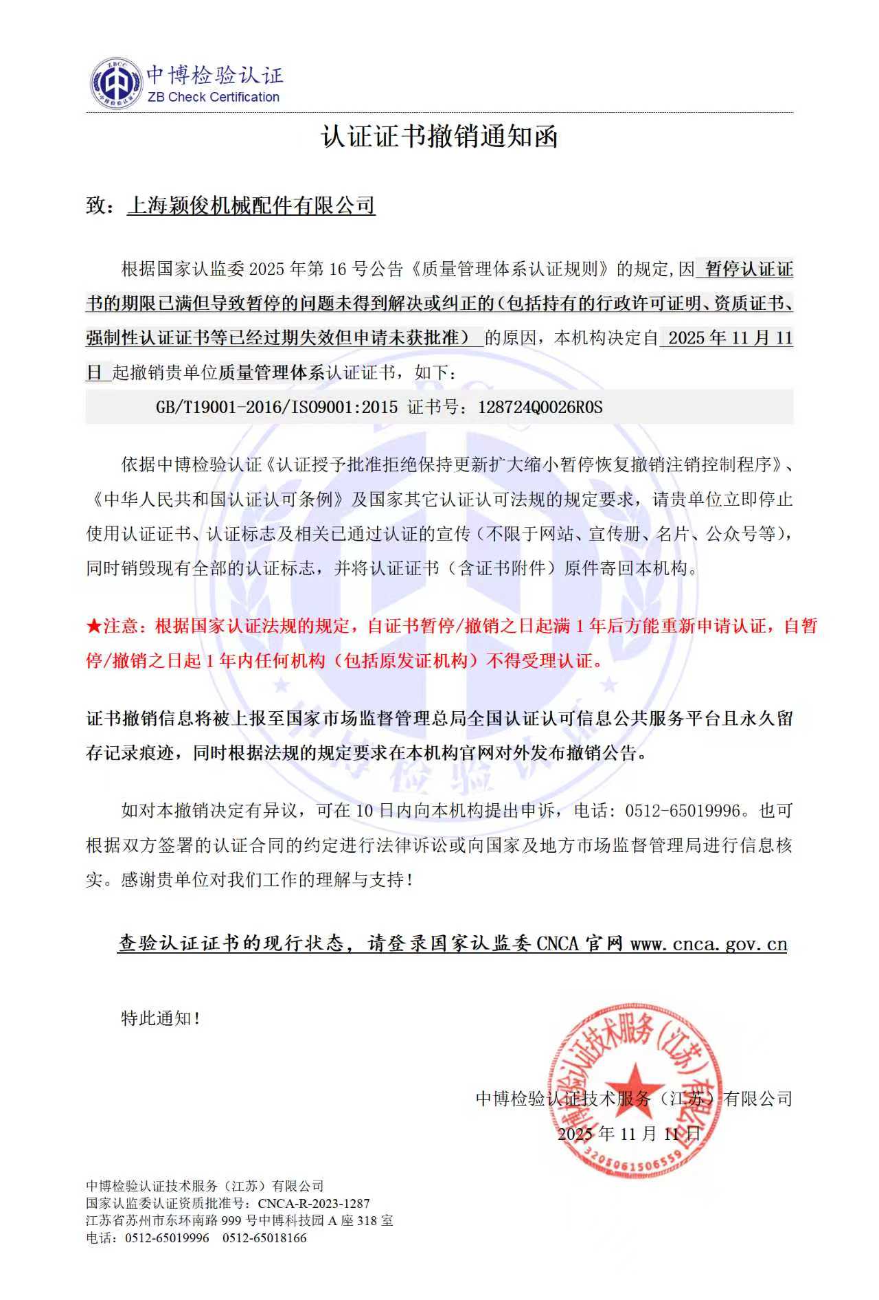 撤销上海颖俊机械配件有限公司IS09001:2015质量管理体系认证证书