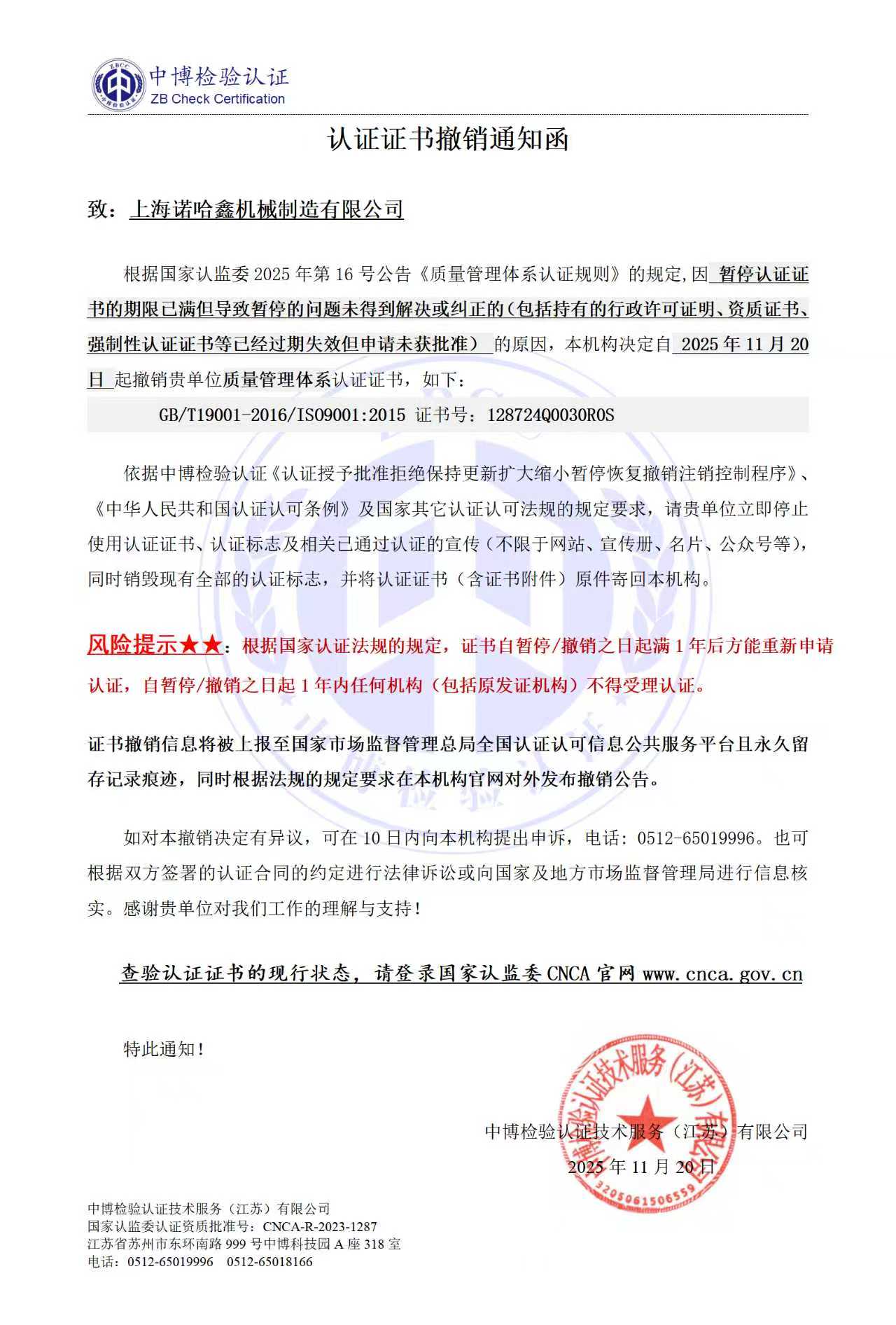 2、证书暂停/撤销信息将被上报至国家市场监督管理总局全国认证认可信息公共服务平台且永久留存暂停/撤销记录痕迹。