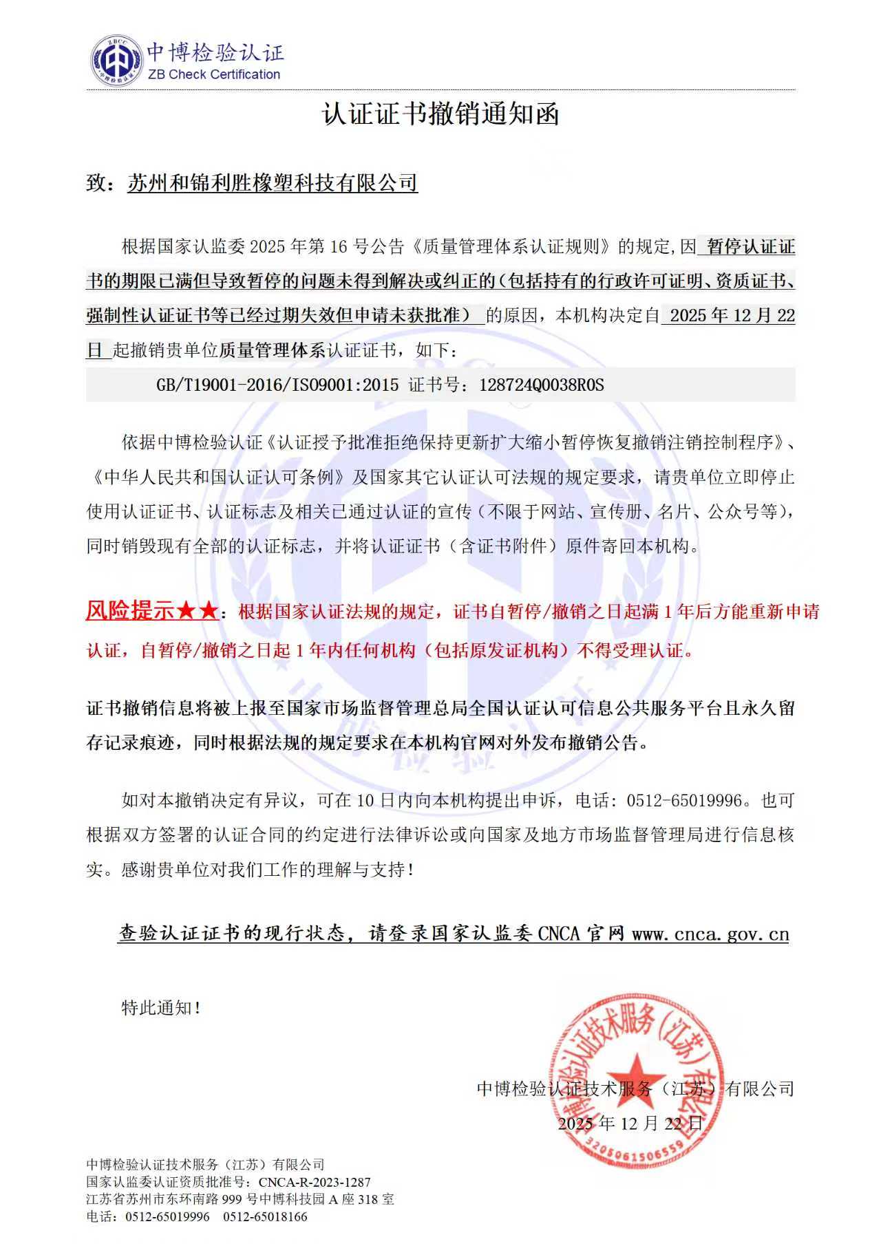 2、证书暂停/撤销信息将被上报至国家市场监督管理总局全国认证认可信息公共服务平台且永久留存暂停/撤销记录痕迹。
