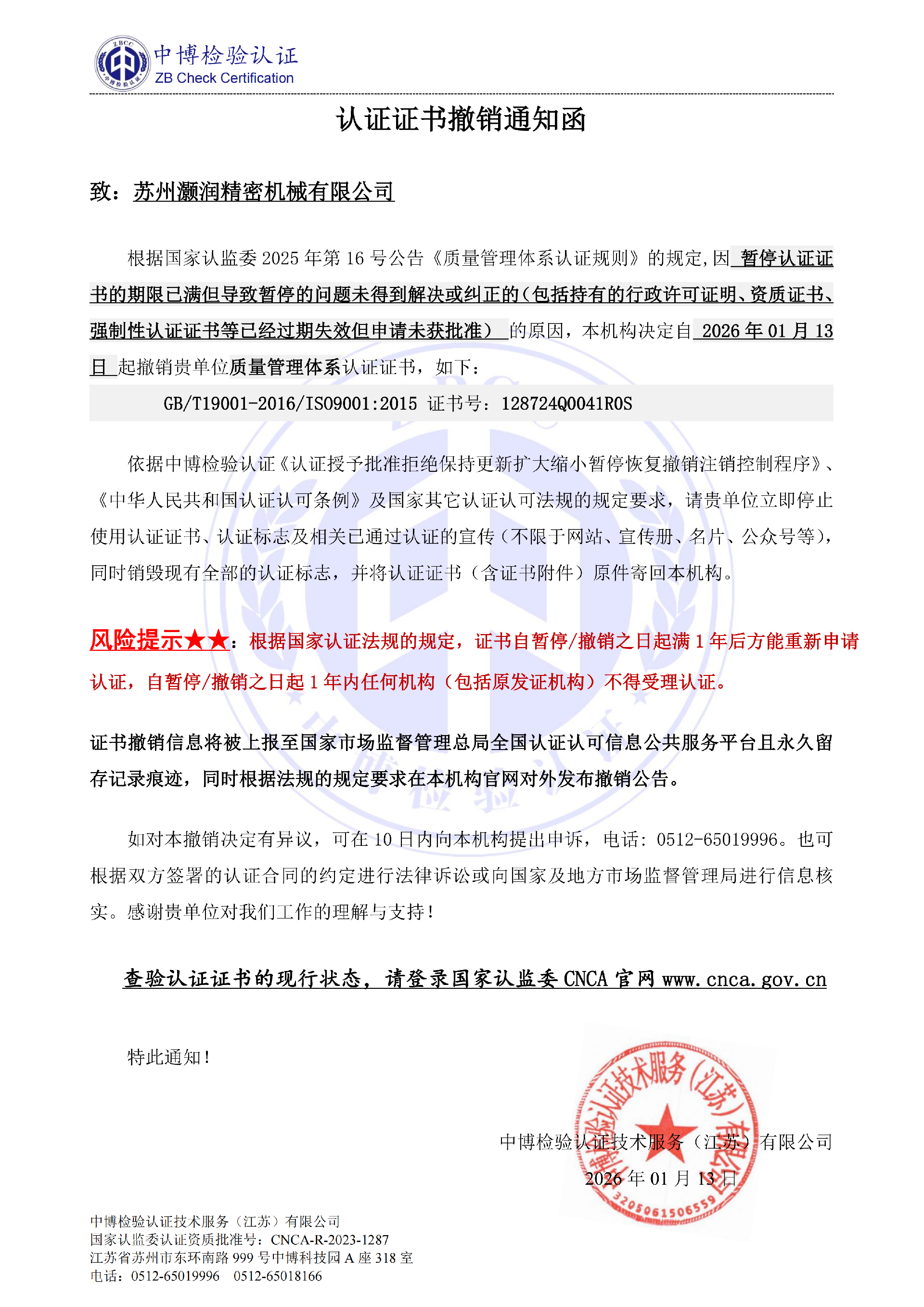 2、证书暂停/撤销信息将被上报至国家市场监督管理总局全国认证认可信息公共服务平台且永久留存暂停/撤销记录痕迹。