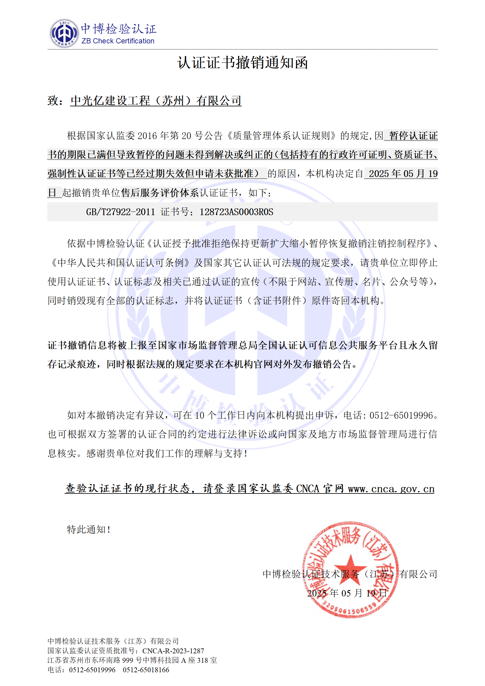 2、证书暂停/撤销信息将被上报至国家市场监督管理总局全国认证认可信息公共服务平台且永久留存暂停/撤销记录痕迹。